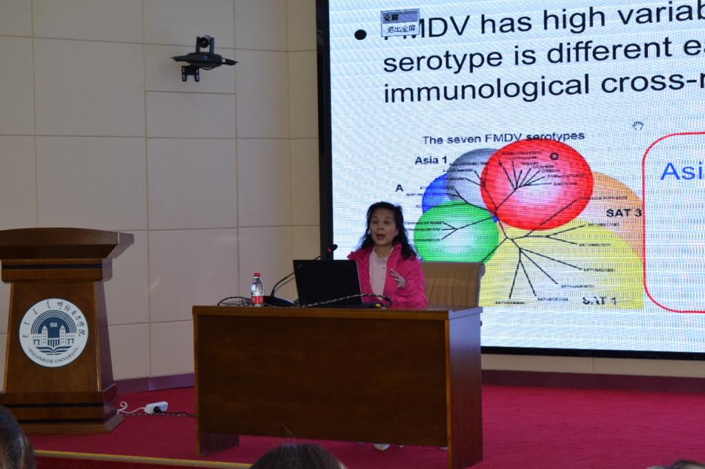 学术报告会上,袁沅教授作了“Nonlinear Dynamics in Modeling Sea Lice with Stage Structure”的学术报告。她结合中国大陆养殖牛羊等牲畜的情况,概述了牲畜感染和传播口蹄疫的基本情况,并介绍了口蹄疫传播模型的建模过程,以及模型定性分析与数值模拟。