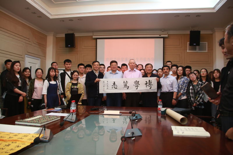王曙光校长对康庄先生的到来表示热烈欢迎,并从书法研究创作和作品格调等方面对康庄先生进行了评价。康庄先生与大家分享了自己的书法学习历程、书法创作体会和书法学习的收获。与会人员与康庄先生在书法技巧和理论研究等方面进行了交流和探讨。同时,康庄先生对学生的书法作品进行现场指导。最后,康庄先生挥毫泼墨,即兴创作,为学校题写了作品“博学笃志”,为现场师生上了一堂生动的书法创作观摩课。