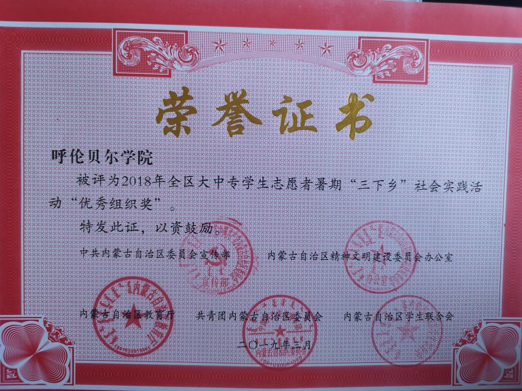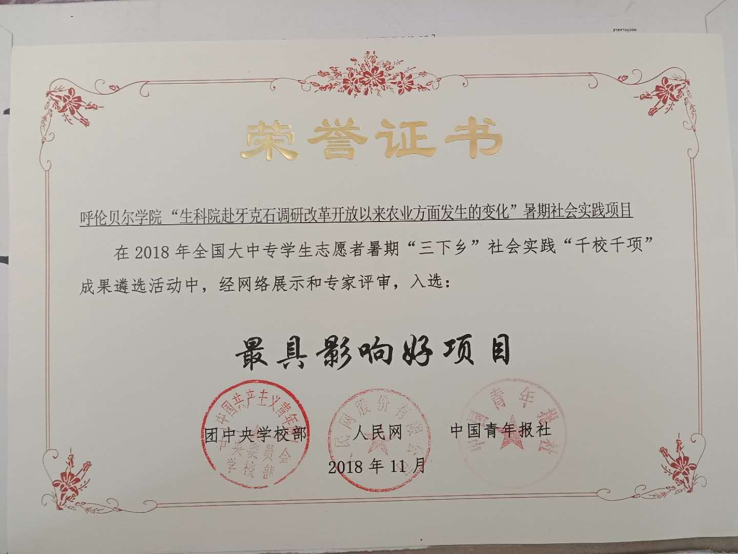 此外,去年11月,在团中央学校部、全国学联秘书处下发的《关于2018年全国大中专学生志愿者暑期“三下乡”社会实践活动的通报》中,贝博团委荣获全国“三下乡”社会实践活动“优秀单位”称号(全区6个),“生科院赴牙克石调研改革开放以来农业方面发生的变化”实践团队获“最具影响好项目”称号。