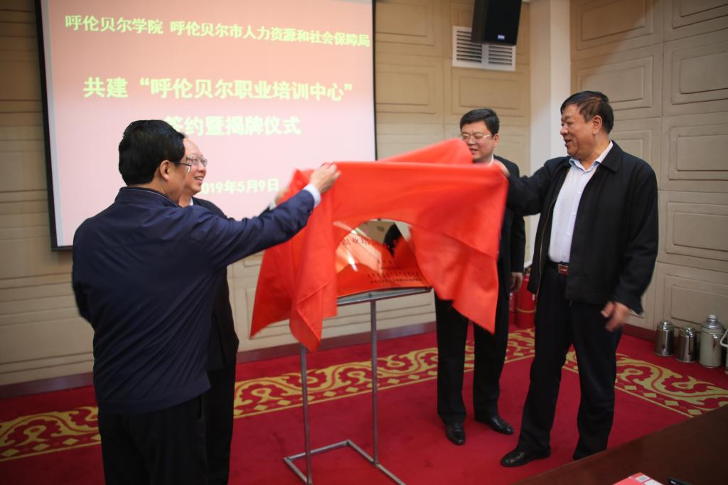 讲话结束后,王曙光校长和罗吉舫局长分别代表合作双方在协议书上签字。陈智副市长、罗吉舫局长和韩猛书记、王曙光校长共同为“呼伦贝尔职业培训中心”揭牌。