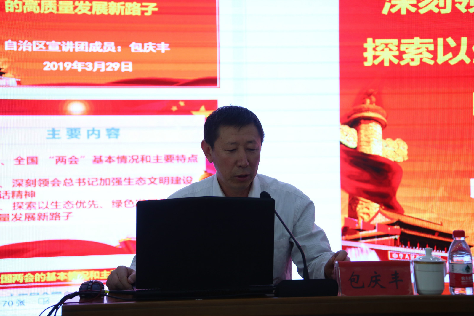 3月29日下午,在崇文楼A座201会议室,贝博举办了2019年首场形势政策报告会。特邀内蒙古农业大学马克思主义学院院长、博士生导师包庆丰教授做主题为“深刻领会总书记重要讲话精神,探索以生态优先、绿色发展为导向的高质量发展新路子” 的专题报告。呼伦贝尔市委宣传部副部长刘立东,校党委副书记张国栋,党委委员、副校长乌云达来、副校长孟祥宏、纪检委书记岳勇等在家的校领导、校党委理论学习中心组成员、机关党委党员干部、学生代表参加了报告会。报告会由校党委委员、宣传部部长刘秀兰主持。