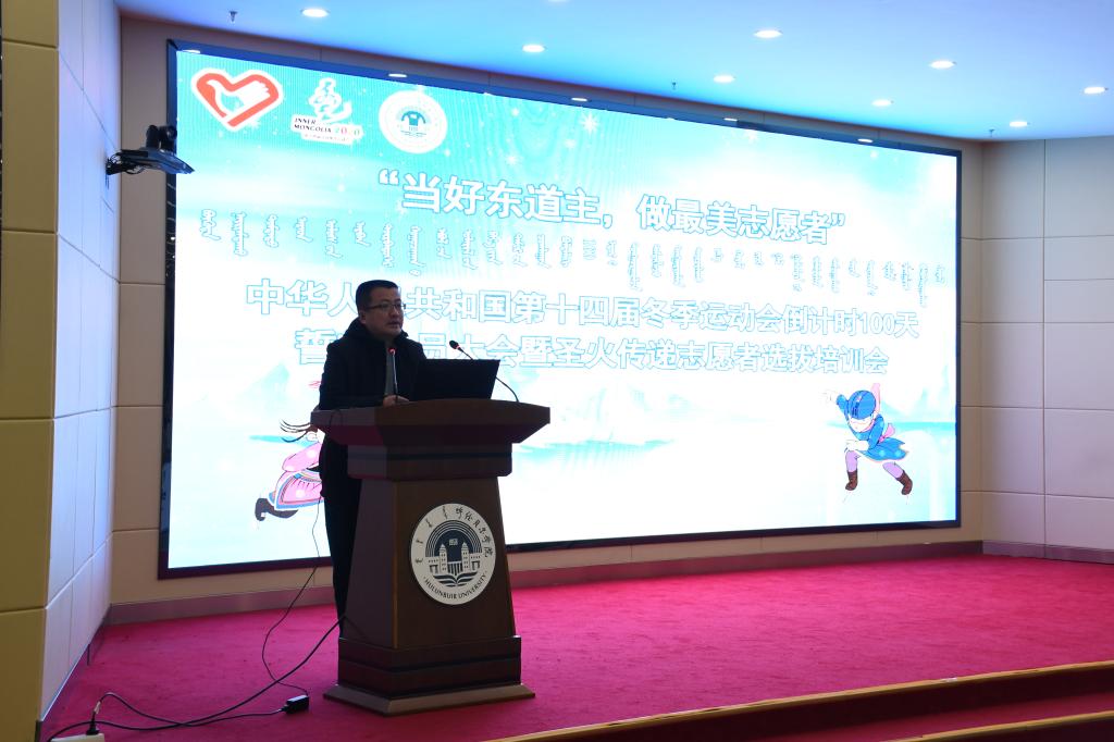 动员大会上,志愿者张吾佳同学,带领全体志愿者为服务十四冬做出庄严宣誓,承诺将会用最美的微笑,成为内蒙古最美的名片。随后冷红焱同学作为志愿者代表,向贝博全体志愿者发出倡议“志愿服务十四冬,做大美呼伦贝尔的代言人。”校团委书记郝新君为在场的志愿者们进行了动员讲话,他表示学校将会在衣食住行等各方面保障贝博志愿者,他鼓励所有志愿者“不管是台前还是幕后,希望大家都能够同甘苦、共奋进,迎接挑战、细节做起,追求卓越,用自己的“细心、耐心、热心、精心”,全身心地投入到志愿服务中去,践行志愿精神,为赛会奉献智慧和力量。”动员会最后,贝博曾经参加过“十四冬”测试赛、资格赛的三名志愿者代表,与全体志愿者分享了他们的志愿服务经历,通过三位同学通过的分享,让所有志愿者对即将到来的“十四冬”赛会服务工作多了份期待与担当。誓师动员大会结束后,在贝博现有礼仪志愿者中进行了圣火传递志愿者的选拔。