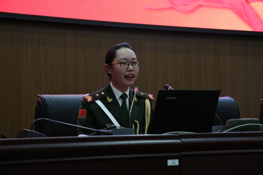 宋雪婷,先后担任过艾佛森贝博ballbet官网民兵应急营特战二连战士,特战二连三排三班班长,国旗护卫队国旗分队分队长,国旗护卫队指导员等职务,今年参加内蒙古自治区高校国旗护卫队交流展示活动并取得优异的成绩。她向同学们介绍了呼院民兵应急应这支优秀的队伍以及队员们的刻苦训练、圆满完成各项任务的艰辛历程。