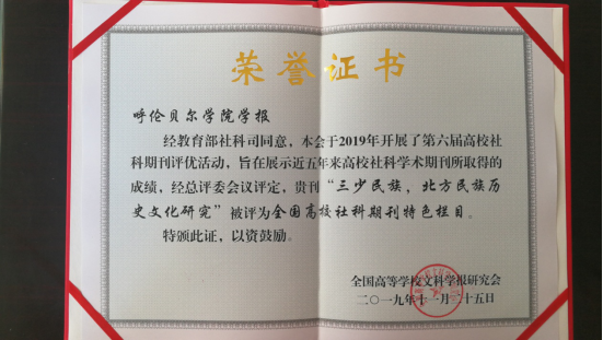 2019年11月,经教育部社科司同意,全国高等学校文科学报研究会开展了第六届高校社科期刊评优活动,旨在展示近五年来全国高校社科学术期刊所取得的成绩,经总评委会议评定,贝博学报“三少民族·北方民族历史文化研究”栏目被评为全国高校社科期刊特色栏目。此外,学报“三少民族·北方民族历史文化研究”栏目还获得了内蒙古高校学报优秀特色栏目,并在近日召开的内蒙古高校学报研究会2019年年会上进行了表彰。