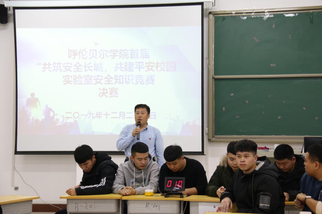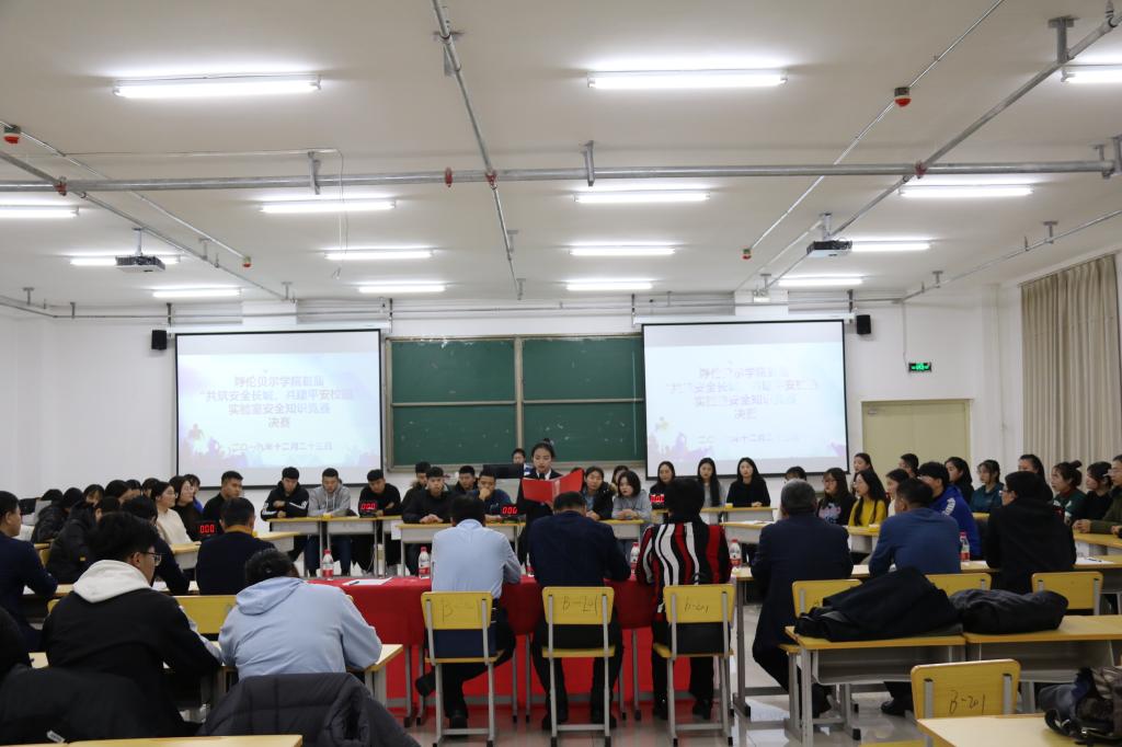 12月23日下午,在崇文楼B201教室,贝博举办了首届实验室安全知识竞赛决赛。此次活动由学校教务处、校园安全管理处主办,化学化工学院、生命科学学院、农林学院联合承办,化学化工学院实验实训中心、团总支学生会、青年志愿者协会、化海实践社团协办。大赛以“共筑安全长城,共建平安校园”为主题,旨在培养学生实验室安全意识,进一步落实《教育部办公厅关于进一步加强高校教学实验室安全检查工作的通知》《内蒙古自治区教育厅关于创建平安校园的制度意见(试行)》等关于实验室安全、校园安全的具体要求,强化学校实验室安全教育、创建平安校园。教务处处长尹立军、校园安全管理处处长毛永强、化学化工学院党总支书记何平、院长白晓艳、党总支副书记刘朋、副院长姜作杰、生命科学学院院长谢宾、副院长高明华、农林学院副院长王常顺、校园安全管理处治安科科长聂忠义到场观看比赛。