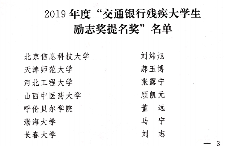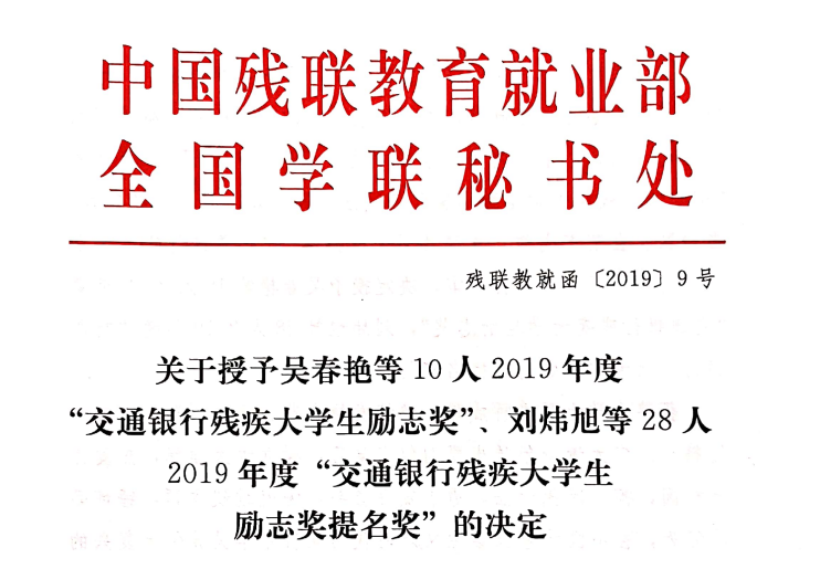 由中国残联教育就业部、全国学联秘书处联合开展的2019年度“交通银行残疾大学生励志奖”评选于今日公布获奖名单,贝博化学化工学院2017级应用化学班董远同学经过学校推荐、自治区、国家评选推荐,荣获“交通银行残疾大学生励志奖提名奖”。