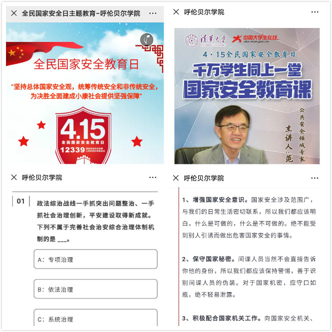 同时,通过学校官方微信平台推送了由中国大学生在线主办的“千万学生同上一堂国家安全教育课”、开展了国家安全知识线上答题活动,对国家安全相关知识进行宣传普及,让师生充分认识国家安全的重要性,营造维护国家安全的良好社会氛围。利用网络组织全体学生在线观看了视频学习宣传片,同学们认真观看并在线彼此交流了心得感受,一致认为只有大家认识到位,行动才会自觉,实践才有方向,才能让法治力量为国家安全保驾护航。