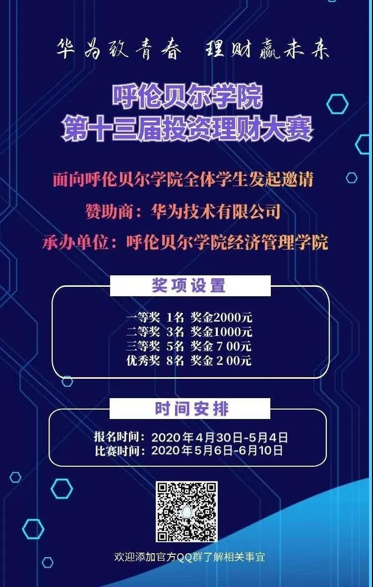 本次比赛旨在提高同学们对投资理财的理解,使同学们能够通过投资理财技能与知识的实践性学习,在大学生中普及金融投资知识,培养投资理财意识,提升投资理财技能。大赛由华为技术有限公司作为支持单位,并向校方提供资金支持。
