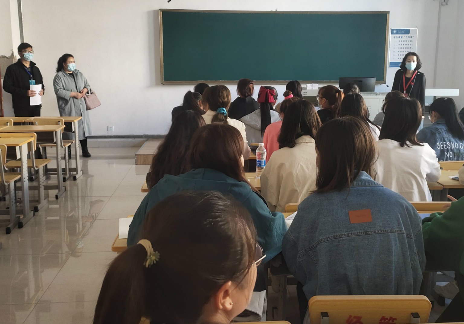 学校非常重视此次学生返校复课教学准备和保障工作,为了解此次学生返校复课的各项教学准备情况和师生返校复课情况,早上7:40,教务处联合学生工作处深入各教学楼,对各教学单位工作运行状态、教学秩序、学生上课出勤和文明修身等进行检查。从第一天的检查情况看,各学院高度重视,在教学区随处都可见到在开展自查的二级学院领导和老师,各学院能够认真落实期初教学工作会议整体要求和相关工作布置,返校复课教学准备充分,教学区环境整洁卫生,师生返校复课率高,师生精神面貌好。