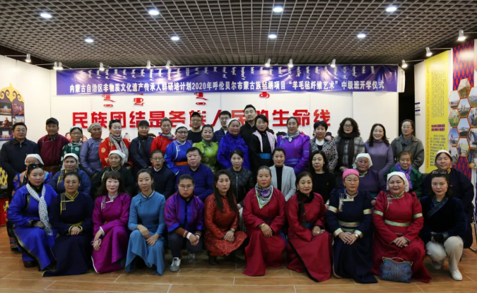 10月15日上午,为传承、推广非物质文化遗产蒙古族毡绣项目,进一步提高传承人群文化艺术素养、审美能力,创新能力,推动传统工艺与现代生活融合发展,科学技术处副处长张桂芝、教育学院院长王毅同呼伦贝尔文化旅游广电局副局长包海明等一行,参加了在新左旗文化馆举办的“2020年度自治区非遗传承人群研培计划”呼伦贝尔市蒙古族毡绣“羊毛纤维艺术”培训班开班仪式。