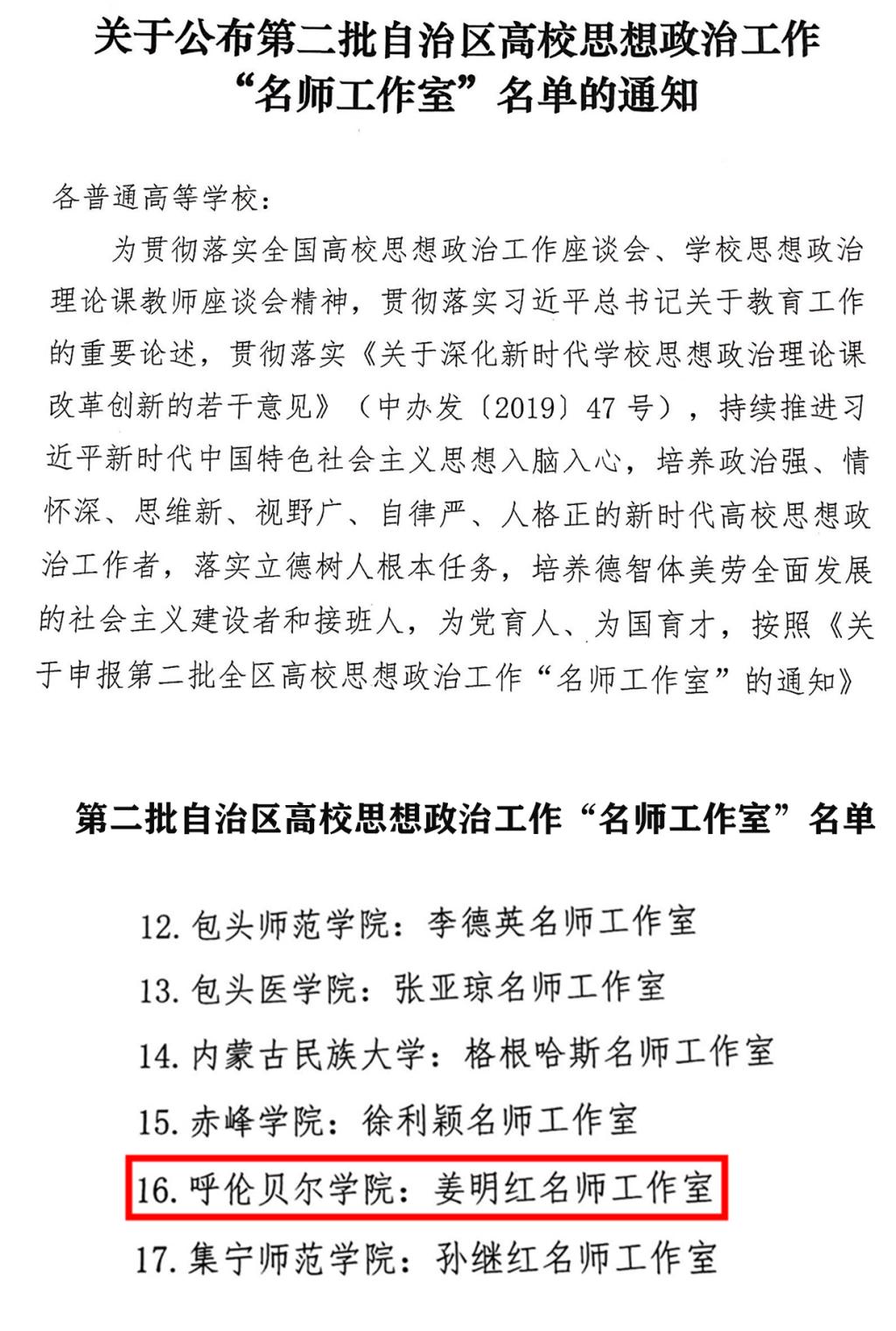 近日,自治区党委宣传部、自治区党委高校工委、自治区团委发布《关于公布第二批自治区高校思想政治工作“名师工作室”名单的通知》,继“王云介名师工作室”获批第一批自治区高校思政名师工作室后,贝博教育学院“姜明红名师工作室”成功入选第二批自治区高校思政名师工作室。