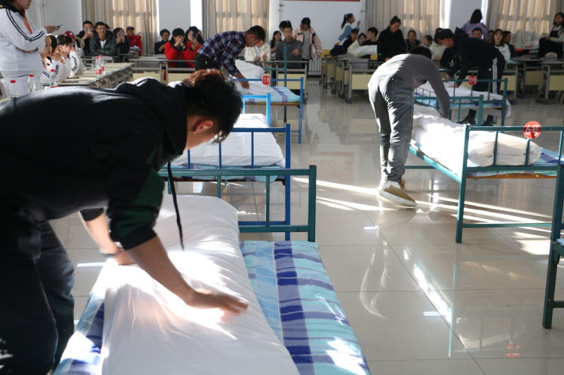 本场比赛由学生工作处宿舍管理科科长王鹏、农林学院团学办主任王兆文、外国语学院团学办主任王晨雪、美术学院团学办主任肖慧英、蒙古学学院团学办主任额尔布乐图、历史文化学院团学办主任赵毓、文学院团学办副主任吴岩敏担任评委。经过各学院组织开展初赛进行选拔,再推荐男女生各一名选手代表学院参赛,四十多位选手经过现场抽签分组进行比赛,为保证比赛公平,统一采用全新被褥,增加了此次比赛的难度,却检验出了参赛选手的真实水平。经过紧张的比赛,最终计算机学院姜东、柴爽脱颖而出,分别获男女组一等奖,数学与统计学院徐帼嫔等10名同学获得二、三等奖。