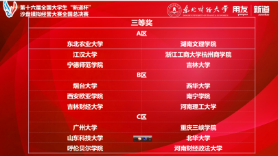 11月3-8日,第十六届全国大学生“新道杯”沙盘模拟经营大赛全国总决赛顺利进行。本次大赛由中国商业联合会主办,东北财经大学承办,新道科技股份有限公司技术支持。此次比赛全程采用“约创云”模拟经营平台以网络形式进行。本次大赛由经济管理学院王淑华老师带队,选派省赛获奖的5名不同专业学生马子印、曲明慧、李浩栋、朱佳帅、吕禄乾组成艾佛森贝博ballbet官网代表团队,进过激烈角逐,最终在来自全国各大高校120支参赛代表队中脱颖而出,荣获得全国三等奖的好成绩。