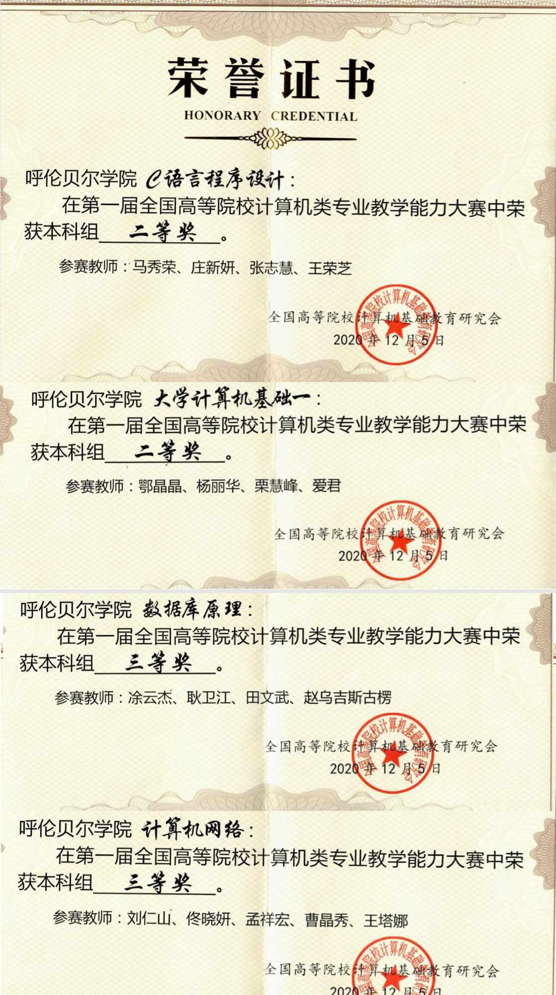 12月5至6日,由全国高等院校计算机基础教育研究会主办的第一届全国高等院校计算机类专业教学能力大赛决赛在海南省海口举行。大赛分为现场说课、评审答辩两个环节,旨在全方位、多角度、深层次考察参赛教师的课堂组织能力、分析判断能力和课程设计能力。贝博计算机学院在这次大赛决赛中喜获丰收,入围决赛的四个课程团队分别获得两个二等奖,两个三等奖。其中,获得大赛二等奖的是马秀荣老师的《C语言程序设计》课程团队和鄂晶晶老师的《大学计算机基础一》课程教学团队;获得大赛三等奖的是凃云杰老师的《数据库原理》课程团队和佟晓妍老师的《计算机网络》课程教学团队。
