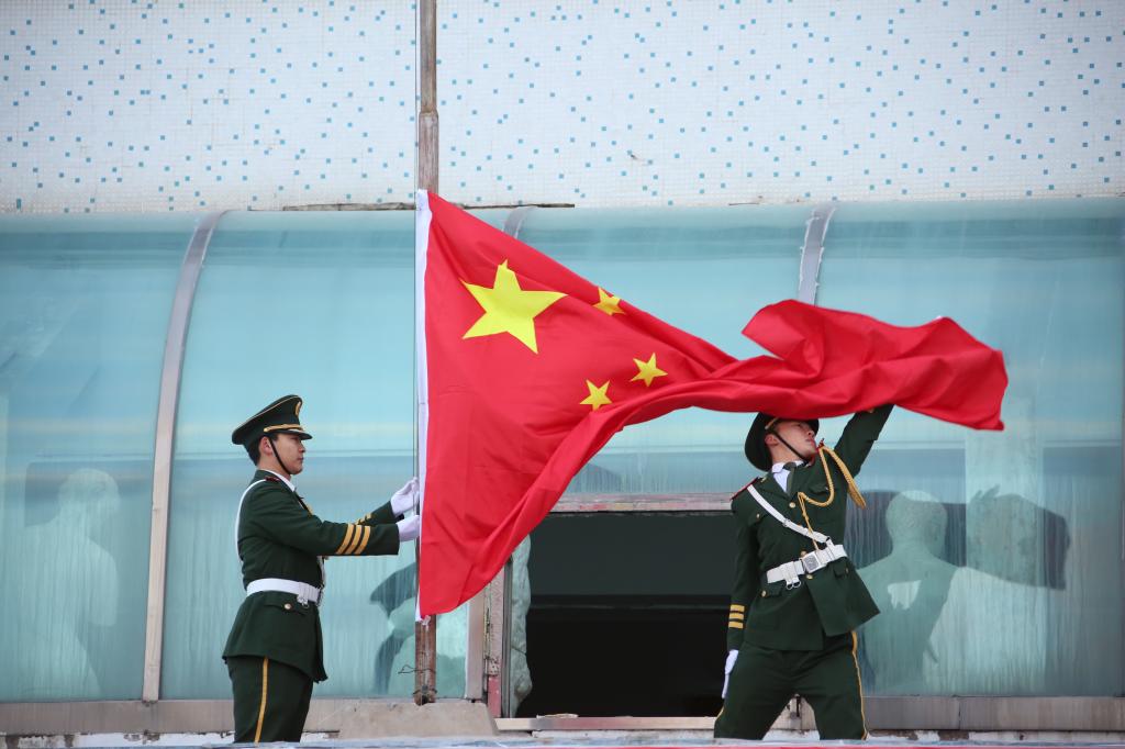 国旗护卫队护送着五星红旗,迈着铿锵有力的步伐走向升旗台。礼宾枪端放,雄壮的国歌奏响。升旗手振臂一挥,鲜艳的五星红旗迎风招展,冉冉升起。在场师生肃然而立,向国旗行注目礼,深怀对祖国无限的热爱和崇高的敬意。