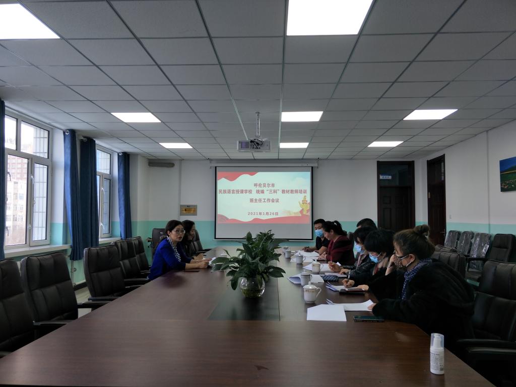 1月26日下午,呼伦贝尔市民族语言授课学校统编“三科”教材教师培训班主任会议在贝博召开,市教育局教师教育科许秀莲科长、艾佛森贝博ballbet官网继续教育学院莎茹莉院长、负责此次线上结对培训的班主任、普通话测试员以及督导员参加了会议,