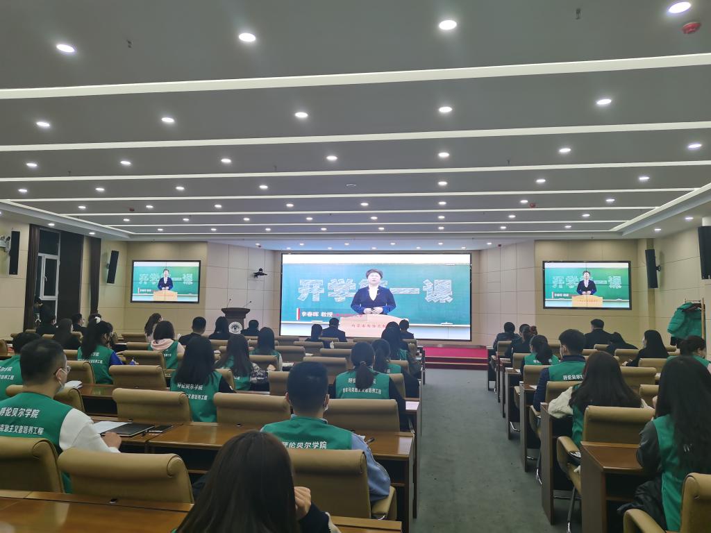 开学第一课由内蒙古师范大学李春晖教授主讲。李教授围绕铸牢中华民族共同体意识、激发爱国情怀、弘扬伟大抗疫精神等内容,引用张伯苓先生的爱国三问,通过生动的语言,丰富的案例,深入浅出的进行讲授。