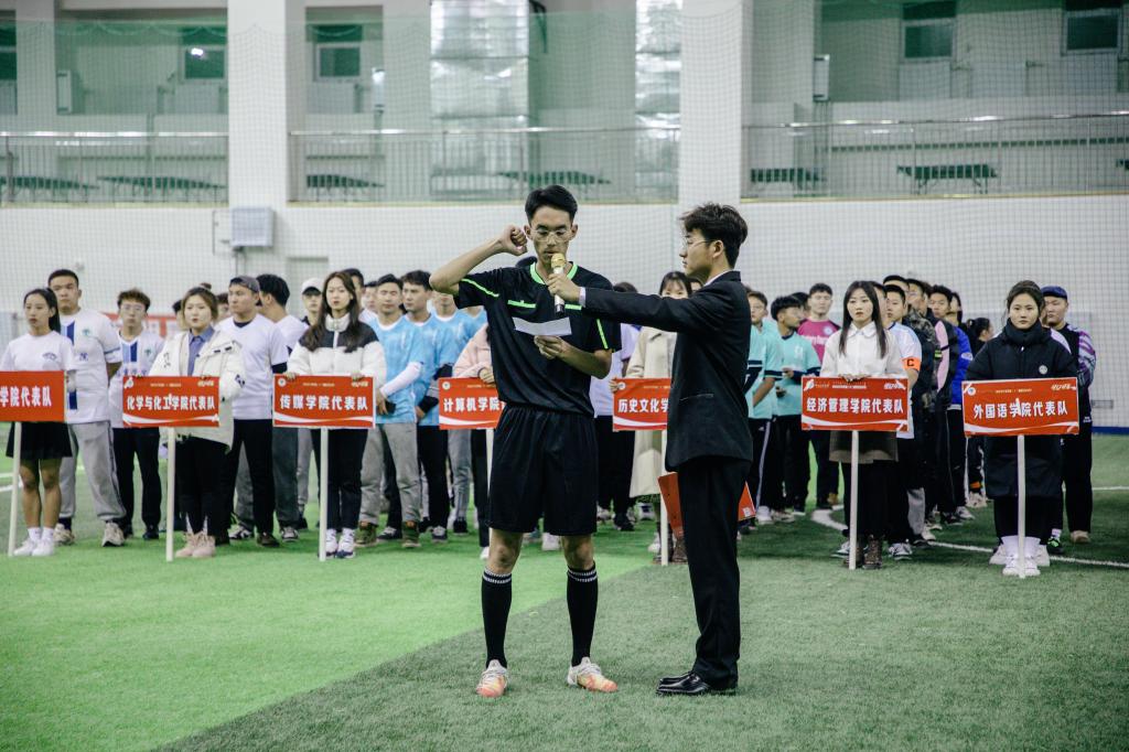 运动员代表和裁判员代表纷纷宣誓,以“重在参与,友谊第一”“公平,公正,公开”原则,保证完成本次比赛的各项任务。随后,李晓峰院长宣布足球赛正式开始。