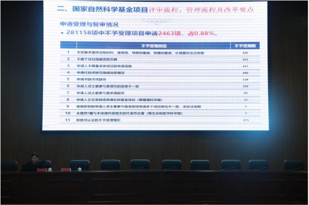 在自科专场上,张桂芝副处长就国家自然科学基金项目类型、申请与资助概况、评审流程、管理流程及改革要点进行了讲解。结合贝博与兄弟院校立项情况,张桂芝副处长提出了申报注意事项。