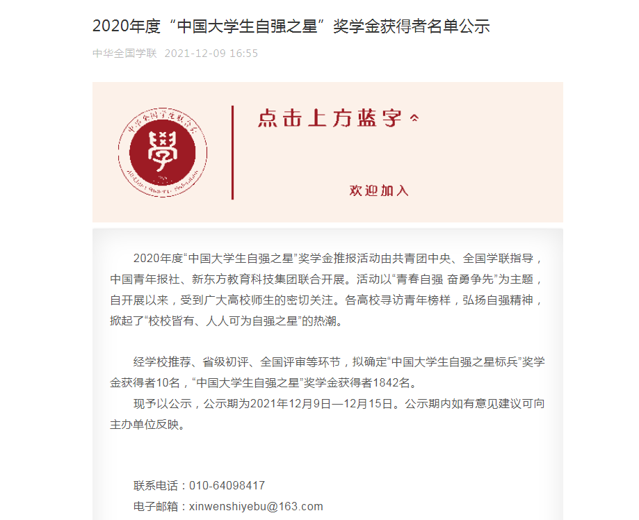 近日,由共青团中央、全国学联指导,中国青年报社、新东方教育科技集团联合开展的2020年度“中国大学生自强之星”奖学金评选活动中,贝博数学与统计学院李传奇同学通过层层选拔,最终被评选为2020年度“中国大学生自强之星”荣誉称号。