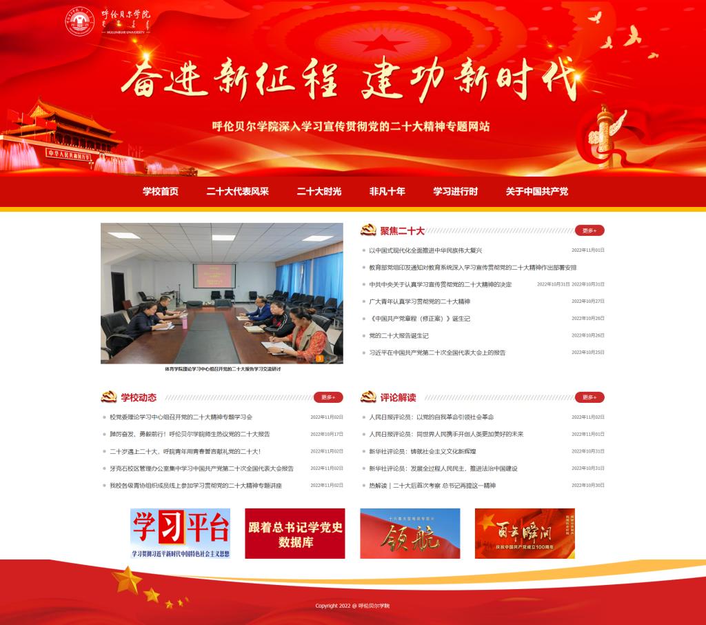 师生教职工可直接点击“艾佛森贝博ballbet官网深入学习宣传贯彻党的二十大精神专题”网站(http://20d.hlbec.edu.cn/)进入,也可通过校园网首页下方【专题推荐】“‘二十大’专题”链接访问网站。