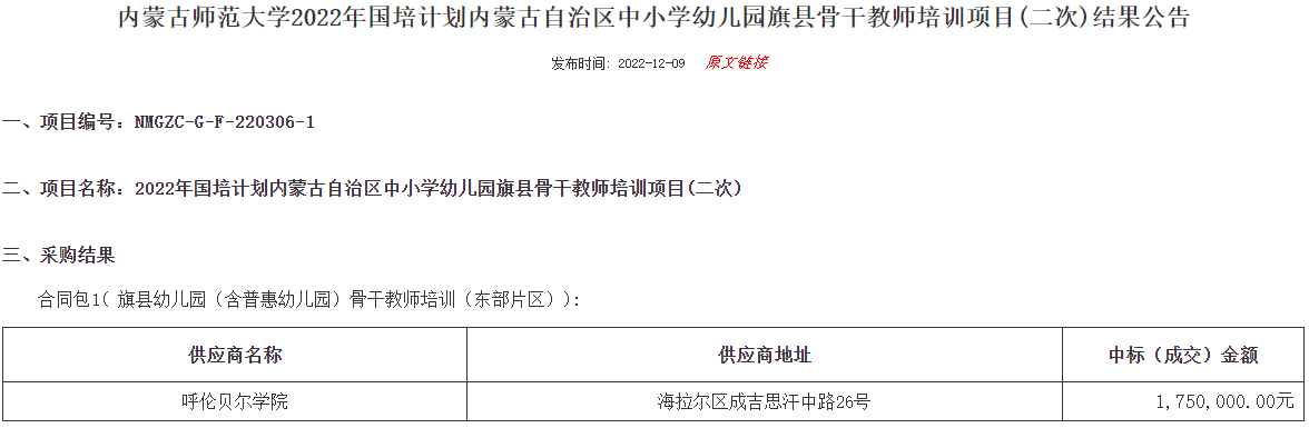 12月9日,内蒙古自治区公共资源交易中心公布《内蒙古师范大学2022年国培计划内蒙古自治区中小学幼儿园旗县骨干教师培训项目(二次)结果公告》中,贝博申报的内蒙古旗县幼儿园(含普惠幼儿园)骨干教师培训(东部片区)、内蒙古边远艰苦民族地区幼儿园顶岗支教培训(东部片区)、旗县级中学骨干班主任能力提升培训(东部片区)等3个项目成功中标,为2022年教师培训立项争资343万元,用于860名教师培训。