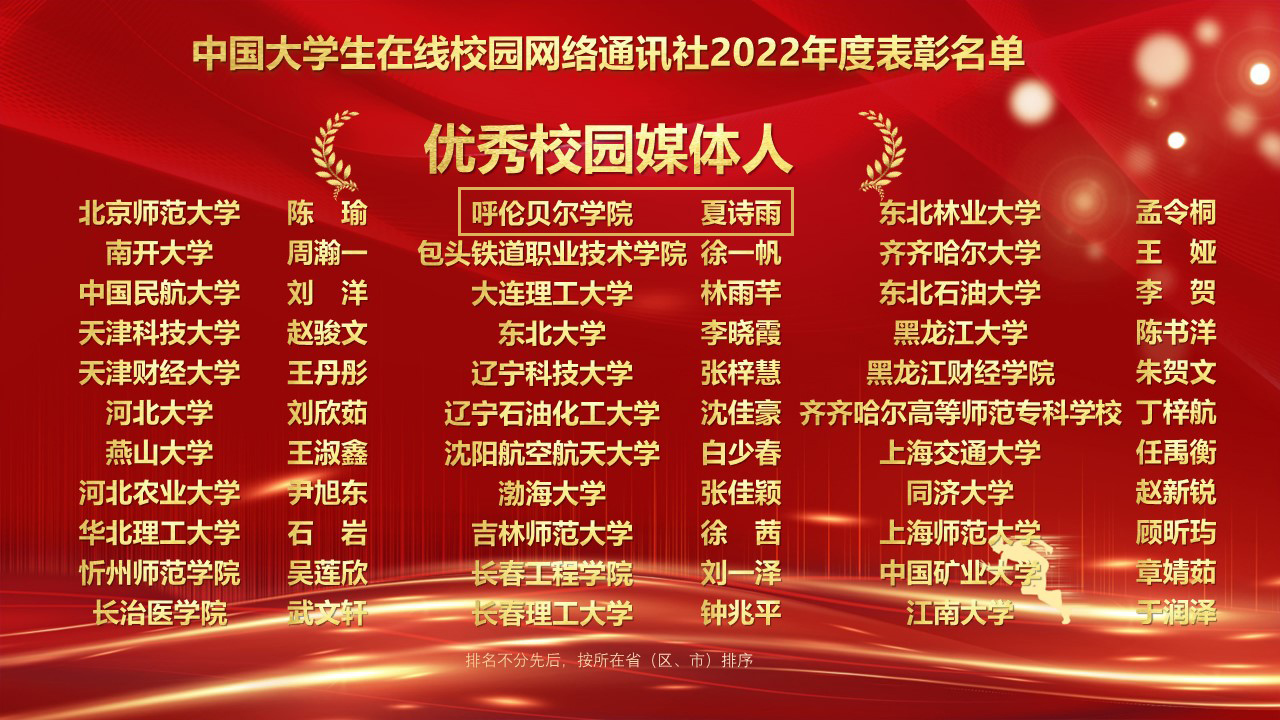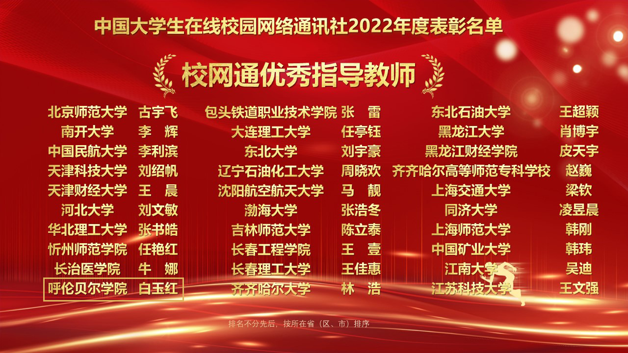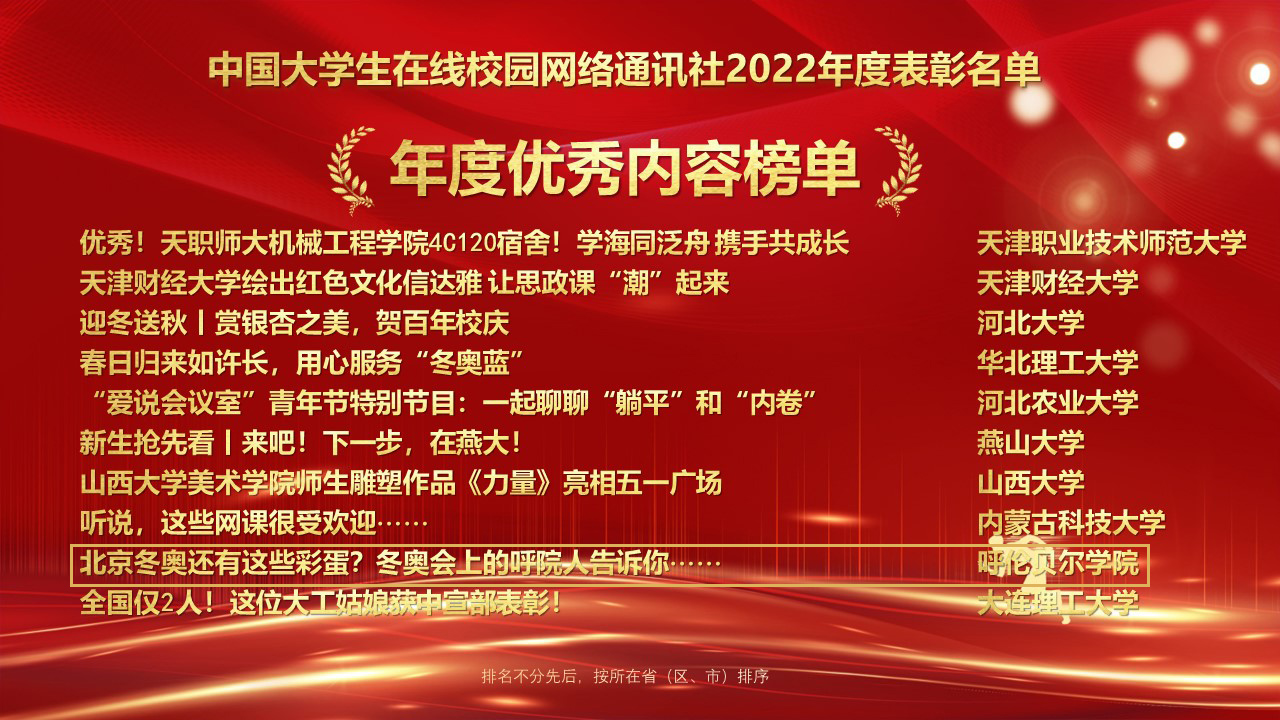 此次表彰中,艾佛森贝博ballbet官网校网通站荣获“优秀校网通站”,党委宣传部荣获“校园行活动优秀组织单位”,文章《北京冬奥还有这些彩蛋?冬奥会上的呼院人告诉你……》获得“年度优秀内容榜单”,党委宣传部宣传文化科科长白玉红荣获“校网通优秀指导教师”,大学生记者团团长夏诗雨同学荣获“优秀校园媒体人”。