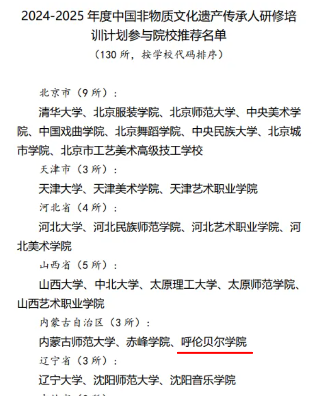 10月7日,文化和旅游部公布了《2024-2025年度中国非物质文化遗产传承人研修培训计划参与院校推荐名单》,全国共有130所院校入选推荐名单,其中,内蒙古自治区共有包括贝博在内的三所高校入选。