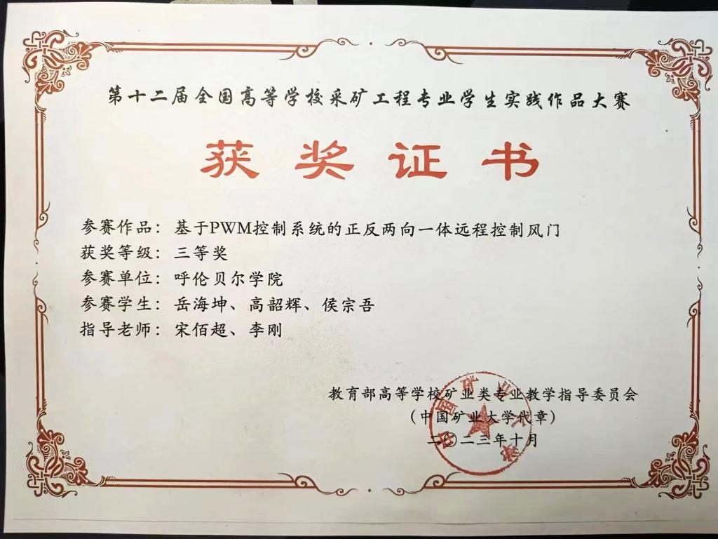 10月16日至19日,由教育部高等学校矿业类专业教学指导委员会主办,江西理工大学、赣南科技学院、江西省岩土力学与工程学会联合承办的第 36 届全国高校采矿工程专业学术年会暨第十二届全国高等学校采矿工程专业学生实践作品大赛在江西赣州举办。由贝博矿业与化学化工学院副教授宋佰超和工学院副教授李刚指导的,2021级采矿工程班岳海坤、高韶辉、侯宗吾等同学共同制作的《基于PWM控制系统的正反两向一体远程控制风门》物理模型在此次比赛中获得三等奖。