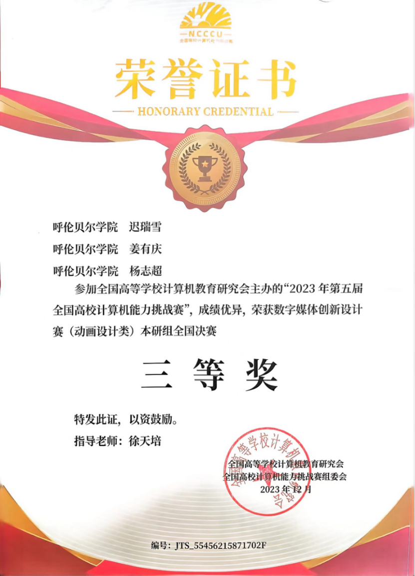 日前,由全国高等学校计算机教育研究会主办的2023年第五届全国高校计算机能力挑战赛决赛顺利完成。全国各地上百所高校的千余支团队参与角逐。由贝博教育学院教育技术系徐天培老师指导,迟瑞雪、姜有庆、杨志超3名学生组成的参赛队伍获得大赛三等奖的好成绩。