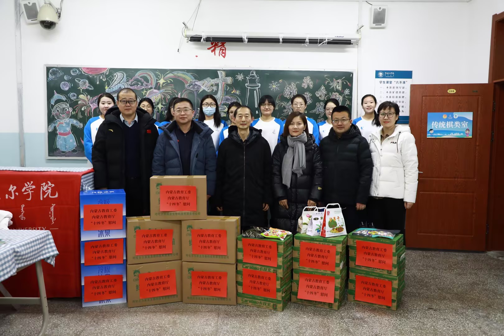 1月28日,自治区教育厅二级巡视员武福英、学生工作处副处长刘惠到贝博慰问“十四冬”志愿者。呼伦贝尔市政府党组成员、副市长马跃东,校党委副书记张宏天及贝博相关职能部门负责人陪同慰问。
