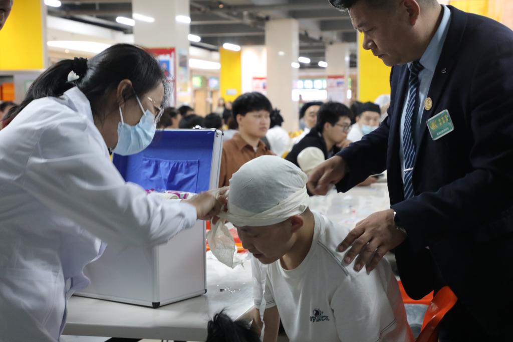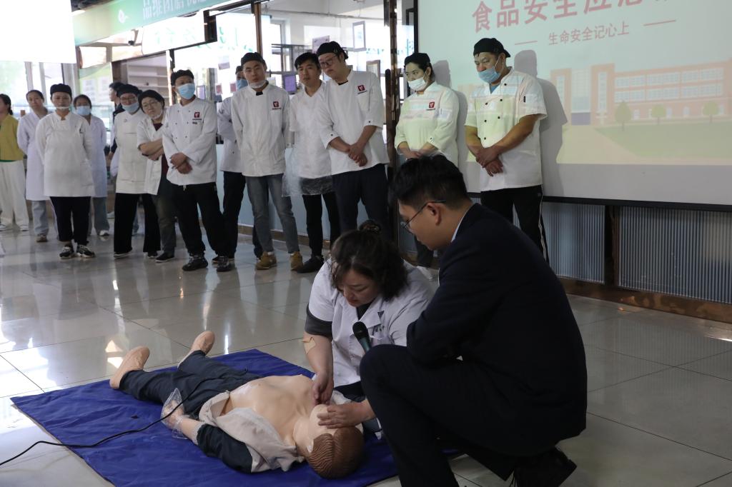 演练过程模拟学生在食堂发生食物卡喉、滑倒摔伤、意外晕倒等突发情况时,食堂工作人员反应迅速,从发现突发情况、进行初步救治、上报相关部门、隔离现场、转运患者、样品采集、追踪调查、信息发布等整个流程有序规范,各部门紧密配合,处置有序得当。最后,校医院工作人员向在场师生普及了心肺复苏施救技巧。