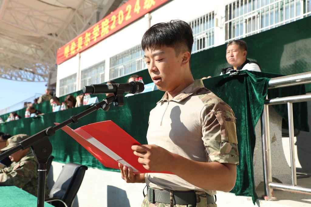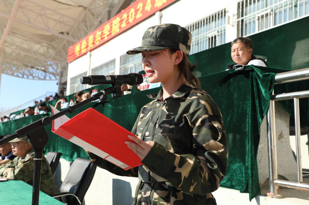 外国语学院赵蕾代表2024级新生发言,她号召全体同学坚决服从指挥、保质保量完成军训任务,尊重教官、团结同学,以最饱满的精神迎接军训,以汗水为墨,橄榄绿为笔,挥洒出一首阳光下最壮丽的青春诗篇。
