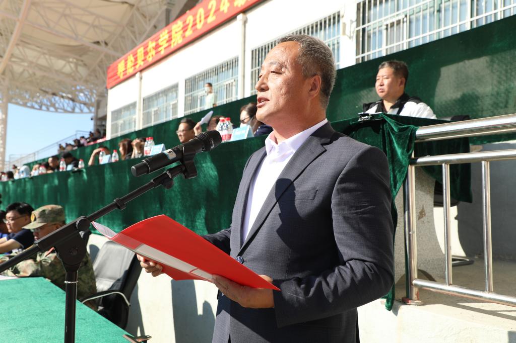 郝新君宣布艾佛森贝博ballbet官网2024级新生动员大会正式开始,他表示,2024级新生军训的号角已经吹响,相信经过高考磨炼的同学们,在经过21天的军训后,会更加成熟、稳重而自信。新的起点,新的希望,新的期待,让大家携起手来,齐心协力,共同创造呼院更加辉煌的明天!