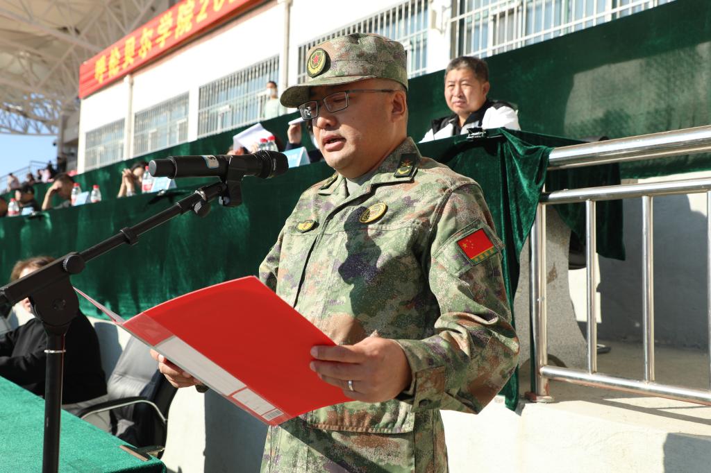 朱泓霖代表军训教官发言,他承诺,全体教官将以高度的责任感和使命感,严格要求自己,认真履行教官职责。以科学的训练方法、严谨的教学态度,为同学们传授军事知识和技能,以身作则,言传身教,为同学们树立良好的榜样。同时,也希望同学们以饱满的热情、昂扬的斗志投入到训练当中,在军训中收获满满,为自己的青春增添一抹亮丽的色彩!