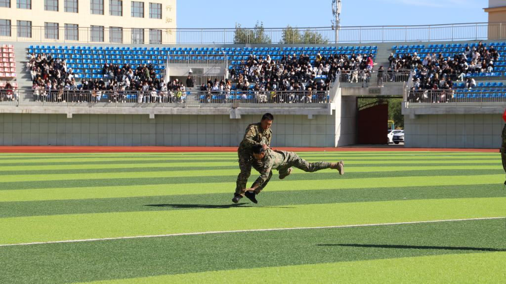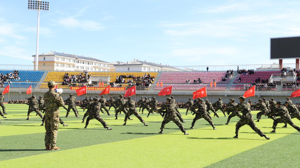 16个学院,66支新生军训方队踏着《中国人民解放军进行曲》的激昂旋律依次走过主席台,他们军容严整、英姿飒爽、脚步铿锵,充分展示了呼院学子斗志昂扬、意气风发的精神风貌和军训取得的丰硕成果。随后,他们在教官的口令声中依次进行了2024级军训学员匍匐刀表演、应急棍术表演、军训教官战术表演等成果展示。现场高潮迭起,掌声雷动。