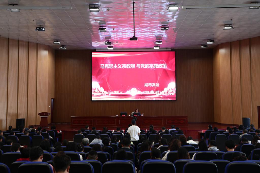 为深入学习贯彻习近平总书记关于宗教工作的重要论述,学习贯彻党的二十届三中全会提出的“要系统推进我国宗教中国化,加强宗教事务治理法治化”,进一步加强贝博干部职工对马克思主义宗教观教育和党的宗教政策法规的学习,10月23日下午,贝博邀请内蒙古大学党委委员、统战部部长斯琴高娃教授在图书馆四楼报告厅作题为《马克思主义宗教观与党的宗教政策》的专题讲座。校党委理论学习中心组成员、全校处级干部及各基层党组织统战委员、专职辅导员等260余人参会。讲座由校党委副书记张宏天主持。