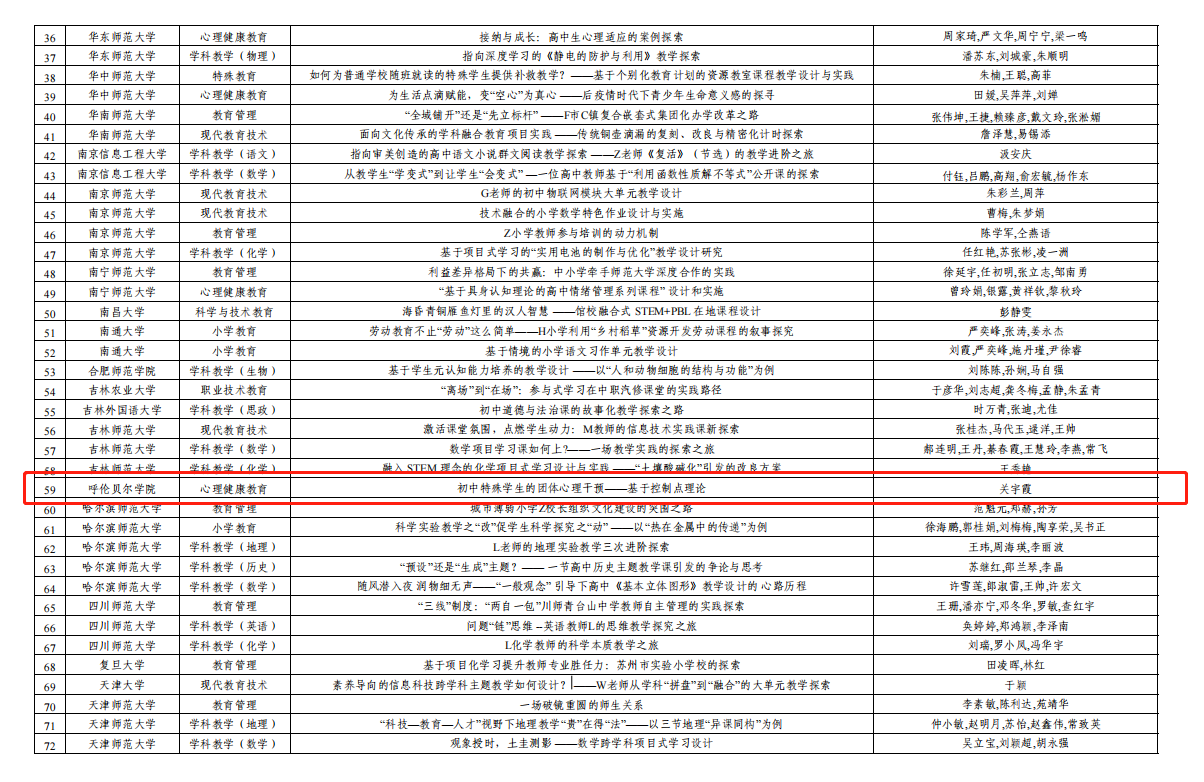 近日,全国教育专业学位研究生教育指导委员会发布了第六届教育专业学位教学案例征集工作评审结果。本届教学案例征集工作共收到全国123个单位提交的808篇教学案例,经全国教育专业学位研究生教育指导委员会组织专家初审、初评、复评、修改后再评审和终评,最终有229篇教学案例通过评审。贝博教育学院关宇霞老师撰写的《初中特殊学生的团体心理干预——基于控制点理论》通过评审,成功入选专业学位教学案例中心案例库。这是贝博首个入选中国专业学位案例中心案例库的教学案例。