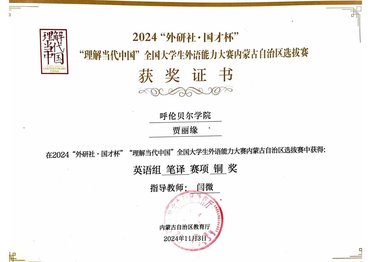 11月2日至3日,由内蒙古自治区教育厅主办、内蒙古大学承办的2024“外研社•国才杯”“理解当代中国”全国大学生外语能力大赛内蒙古自治区选拔赛决赛成功举办。本次大赛汇集了区内19所大学及28所高等职业技术学院的优秀学子,他们围绕短视频、综合能力、演讲、口译、笔译五个赛项展开了激烈的角逐。贝博矿业与化学化工学院2022级化学专业贾丽缘同学在英语组笔译项目中表现出色,荣获铜奖。