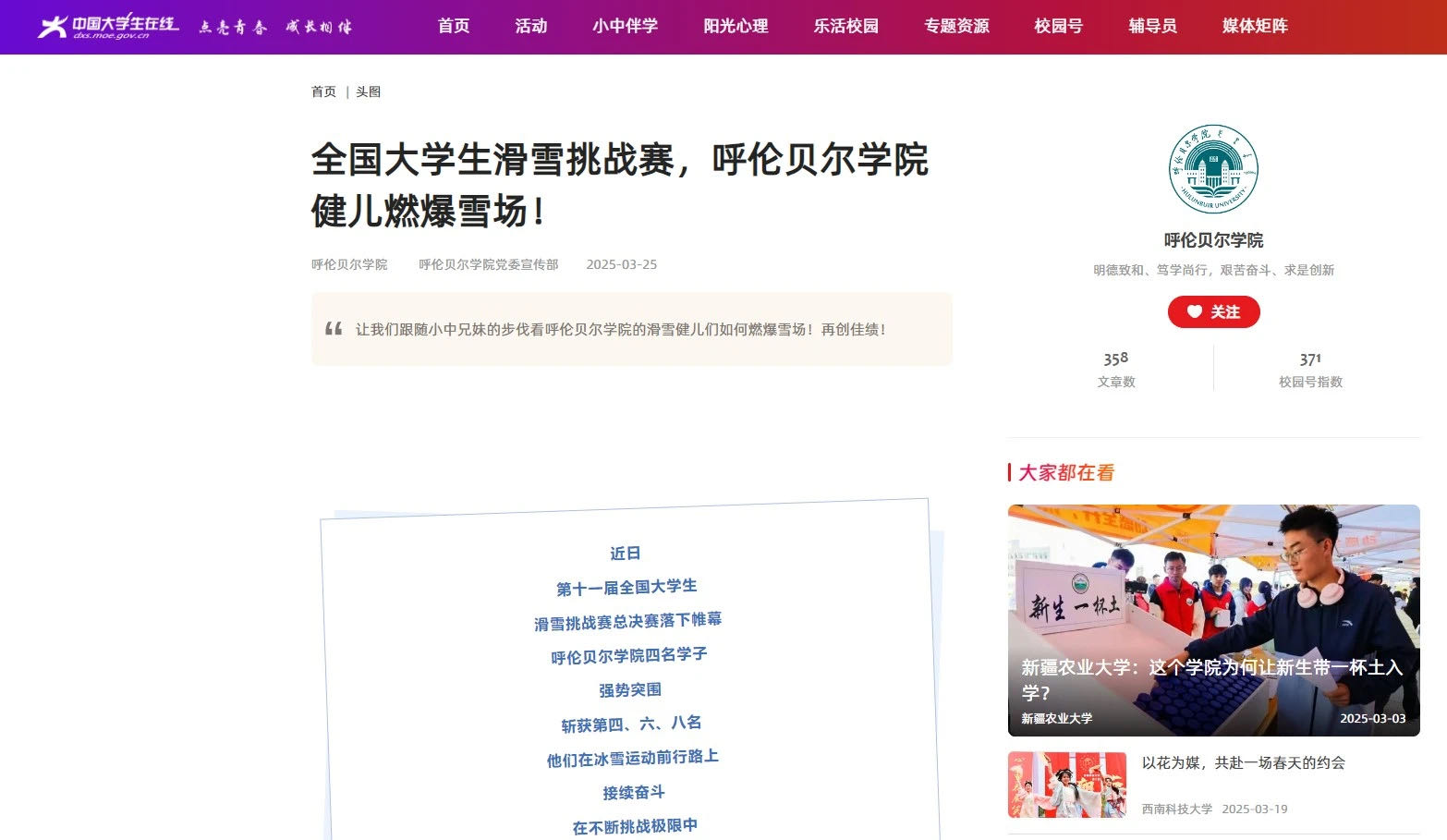 今日,《全国大学生滑雪挑战赛,艾佛森贝博ballbet官网健儿燃爆雪场!》登教育部中国大学生在线网站首页首图!