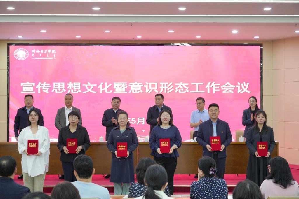 校领导为学校2024年度新闻宣传工作先进集体和先进个人颁发奖状、奖牌,为学校宣讲矩阵各宣讲团负责人颁发聘书。