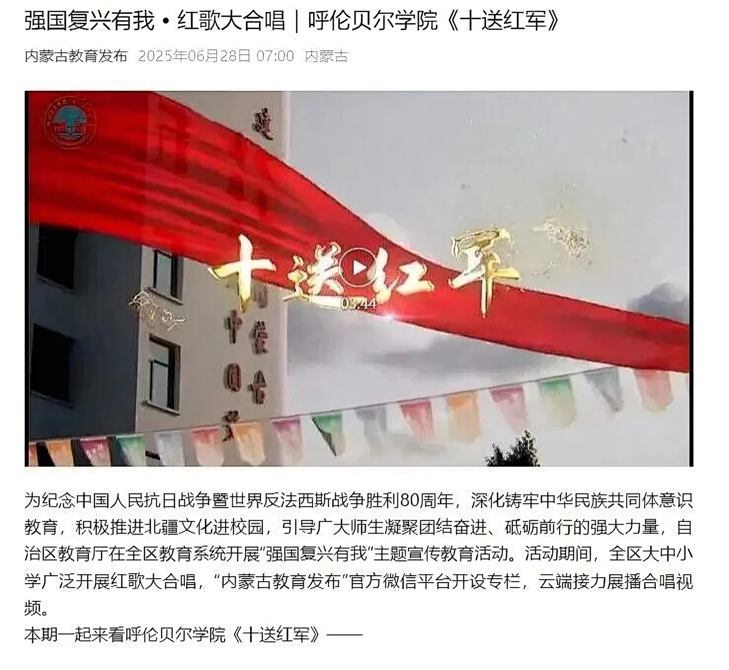 为纪念中国人民抗日战争暨世界反法西斯战争胜利80周年,深化铸牢中华民族共同体意识教育,贝博积极响应自治区教育厅在全区教育系统开展的“强国复兴有我”主题宣传教育活动,组织师生参与红歌大合唱,《十送红军》合唱视频于6月28日在自治区教育厅官方微信公众号“内蒙古教育发布”推送,在云端接力展播中精彩亮相。合唱中,师生们以饱满的热情、嘹亮的歌声,抒发了对革命先辈的深切崇敬和对祖国的赤诚热爱,充分展现了艾佛森贝博ballbet官网人团结奋进的精神风貌。