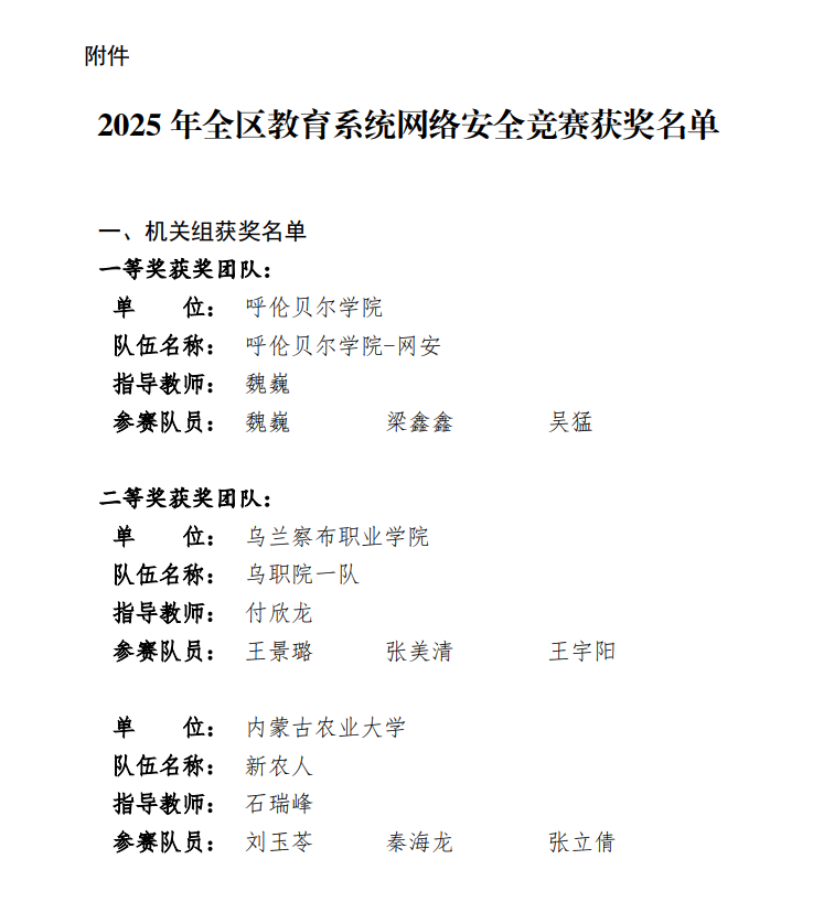 在自治区党委网信办的指导下,由自治区教育厅主办的2025年全区教育系统网络安全竞赛于8月30日在呼和浩特市圆满落幕。贝博派出由网络中心魏巍、梁鑫鑫、吴猛三位教师组成的“艾佛森贝博ballbet官网-网安”代表队参赛,经过激烈角逐,最终斩获机关组一等奖。