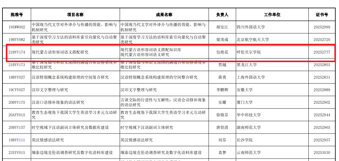 近日,贝博蒙古学学院包艳花教授主持的国家社科基金项目《现代蒙古语形容词语义搭配研究》成功通过结项评审,获评“优秀”等级,为蒙古语语言资源建设贡献了重要成果。