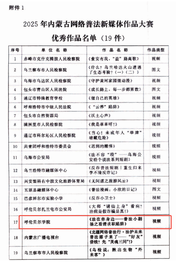 近日,2025年内蒙古网络普法新媒体作品大赛结果揭晓,贝博选送的作品《法在你身边——普法小剧场之看清求职陷阱》脱颖而出,获评优秀作品,并成为全区唯一获奖高校,充分展现贝博在普法领域的实践成效。