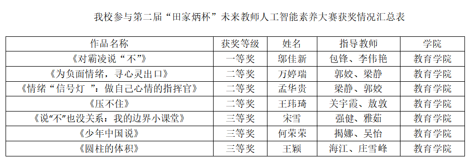 本次大赛以贯彻落实《教育强国建设规划纲要(2024—2035年)》要求,深化人工智能助推教师队伍建设,培养造就适应数智时代需要的卓越教师,促进人工智能助力教育变革为目标,前期历经东北“三省一区”未来教师数字素养大赛预赛、复赛层层选拔,最终于10月初确定来自15所高校的75位选手入围决赛。贝博教育学院高度重视赛事参与,精心遴选优秀学生备赛,最终7位学生入围了“立德树人”“课堂教学”“班级管理”三个主题的决赛,并取得了佳绩。