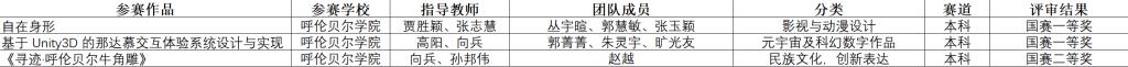 经过校赛、省赛的层层选拔,贝博共有3部优秀作品晋级全国总决赛,并在全国舞台上取得了优异成绩,荣获全国一等奖2项、二等奖1项,充分展示了贝博在数字艺术创新与科技融合领域的教学成果与创新实力,也体现了学校在产教融合、跨学科创新实践中的不断突破。