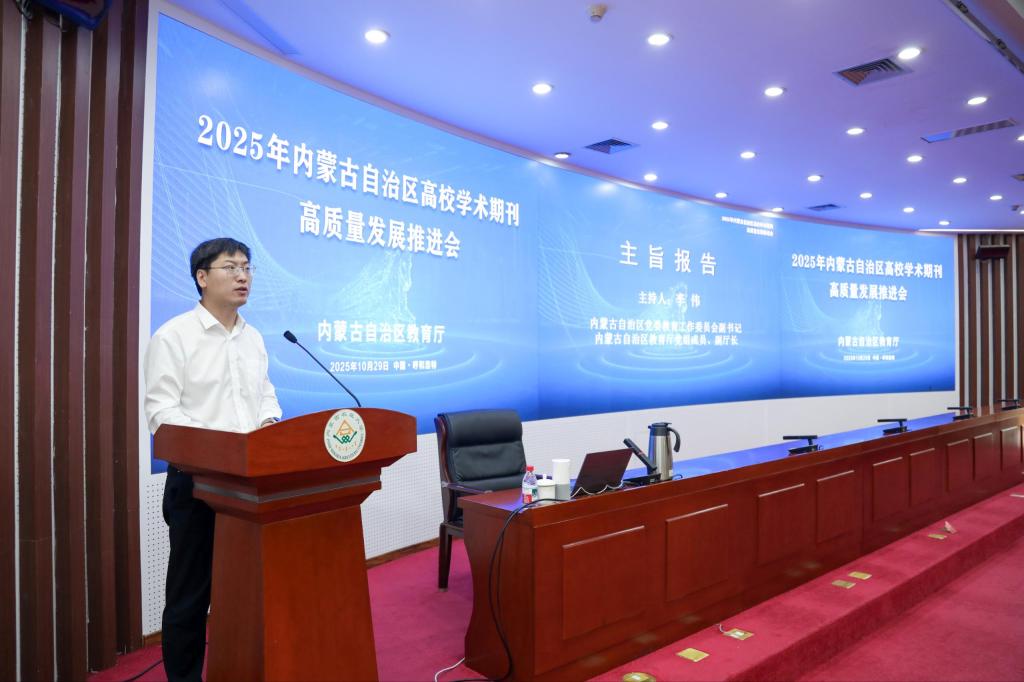 杜汇良在讲话中强调,要进一步提高政治站位,深化思想认识,将办好高校学术期刊作为推动一流学科建设、高校晋位升级以及教育强区建设的重要抓手。他指出,各高校应将期刊高质量发展深度融入学校“十五五”规划编制,设定具备前瞻性且可实现的影响力目标,对标一流,追求卓越,加快走出一条具有内蒙古特色的期刊发展之路。同时,要坚持问题导向,精准剖析制约期刊发展的关键短板,从优化政策供给、创新体制机制、推动资源整合共享等方面综合施策,通过分类管理和支持完善保障体系,全面提升办刊能力,构建定位清晰、动态调整、重点突出、结构合理的期刊发展新格局。他还特别强调,要强化重点攻坚,紧密对接自治区优势学科和特色产业,瞄准国内一流期刊与国际高水平期刊的空白领域,进一步明确期刊定位,打造特色栏目,推进数字化转型,充分发挥学术期刊在学科建设、科技创新与人才培养中的重要作用。