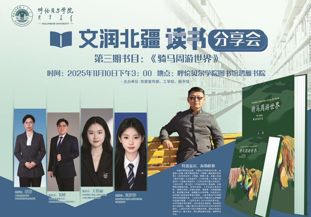 11月10日下午,贝博第三期“文润北疆”读书分享会在图书馆一楼鸿雁书院如期举行。本次活动特别邀请当代著名作家、中国作家协会会员、内蒙古作家协会小说委员会委员、内蒙古作家协会第九届主席团副主席海勒根那来到现场。海勒根那曾斩获全国少数民族文学创作骏马奖、全国百花文学奖中篇小说奖等奖项,此次以其短篇小说集《骑马周游世界》为核心书目开展读书交流。呼伦贝尔广播电视台交通文艺广播主持人白鹤、工学院党委书记彬彬、校党委宣传部副部长白玫以及全校30多名书友会成员共同参与这场文学与思想的碰撞。