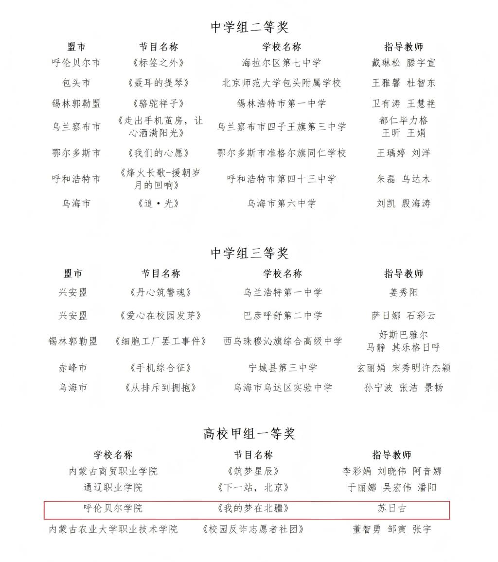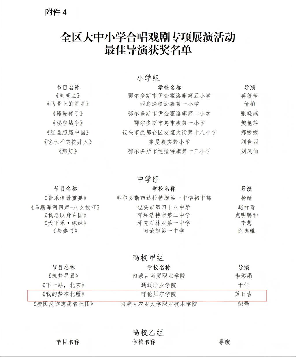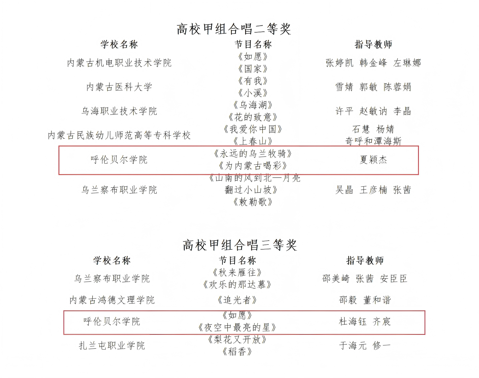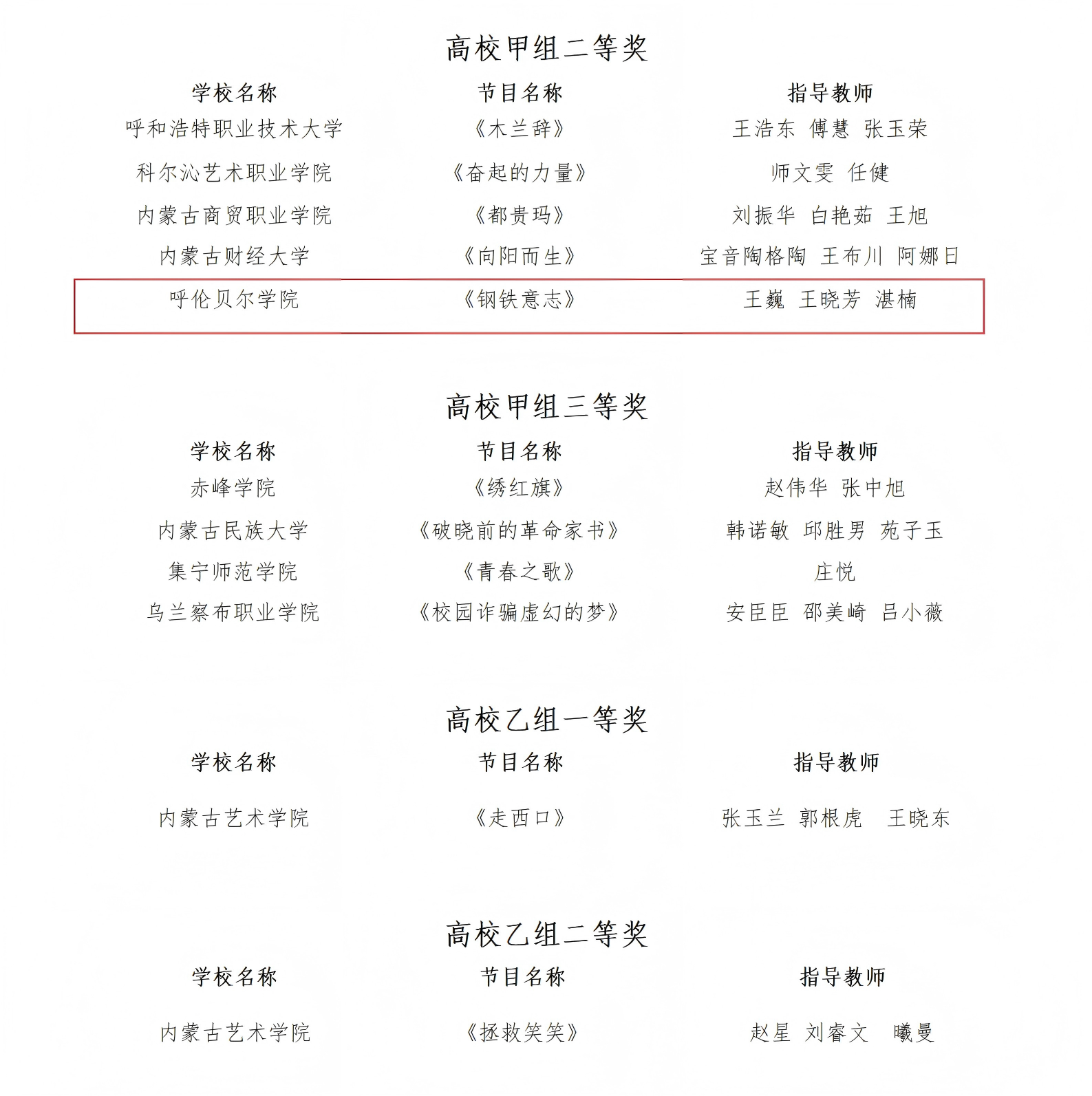 本次展演由内蒙古自治区教育厅主办,以“绽放艺术风采 激发强国力量”为主题,吸引了全区多所大中小学的优质作品同台竞技,竞争激烈。贝博学子凭借扎实的艺术功底、精湛的表演技艺与真挚的情感表达,交出了亮眼答卷:合唱作品《永远的乌兰牧骑》《为内蒙古喝彩》荣获高校甲组合唱二等奖、《如愿》《夜空中最亮的星》荣获高校甲组合唱三等奖;戏剧作品《我的梦在北疆》荣获高校甲组一等奖、《钢铁意志》荣获高校甲组二等奖,《我的梦在北疆》还荣获高校甲组最佳导演奖、优秀创作奖。